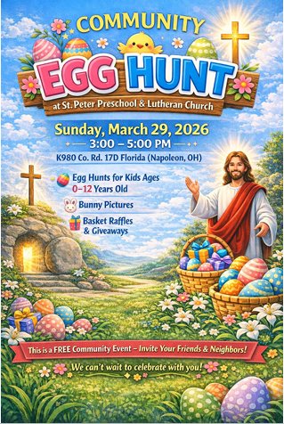 St. Peter Lutheran Church & Preschool is hosting a Community Egg Hunt on Sunday, March 29th from 3:00-5:00pm.