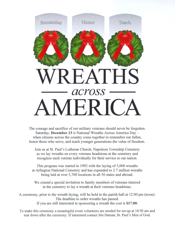 Join us at St. Paul’s Lutheran Church, Napoleon Township Cemetery as we lay wreaths on every veterans headstone at the cemetery and