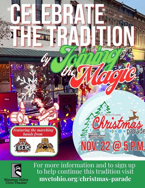Maumee Valley Civic Theater (MVCT) is honored to once again present this annual holiday celebration, beginning at 5:00 p.m. The parade will start at the intersection of West Main and West Perry streets, continue down Main Street, turn onto West Washington Street, and conclude in front of the Henry County Courthouse.