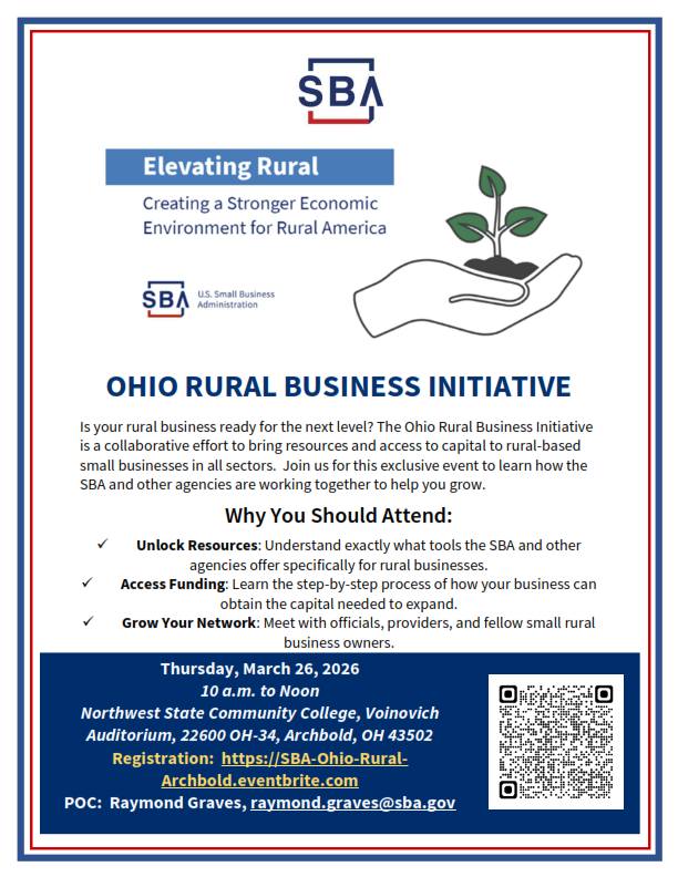 Looking to grow your business, access capital, or understand what resources are available to rural communities? The Ohio Rural Business Initiative is coming to Archbold and bringing the SBA and key partners directly to you.