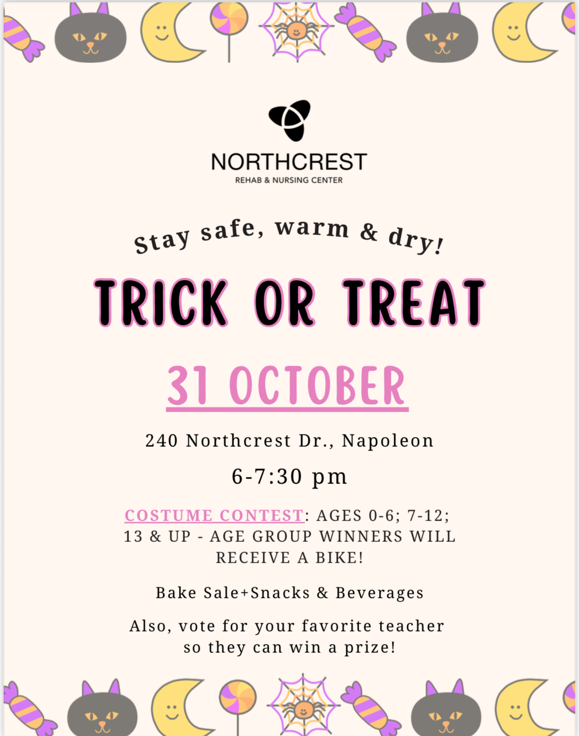 October 31, 2025, 6:00 PM–7:30 PM Trick or Treat at Northcrest Community, Holiday Location: Northcrest Rehab Center, 240 Northcrest Dr., Napoleon, Ohio 43545 Northcrest Rehab offers a warm, safe, and dry place to trick or treat! We will also have a bake sale, costume contest, and will be taking favorite teacher nominations!