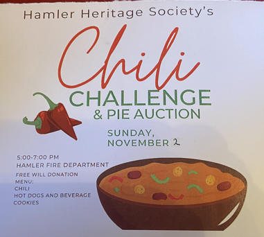November 2, 2025, 5:00 PM–7:00 PM Hamler Heritage Society’s Chili Challenge and Pie Auction Community, Fundraiser, Fundraiser – Food Location: Hamler Fire Department 513 Edgerton St, Hamler, OH 43524 Menu: Chili, Hot Dogs, Beverage, and Cookies