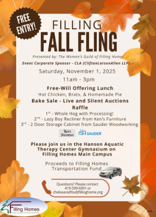 November 1, 2025, 11:00 AM–3:00 PM Filling Fall Fling Community, Fundraiser Location: Filling Homes, N160 State Route 108, Napoleon, OH, United States 43545 Event Sponsor – CLA (CliftonLarsonAllen LLP)