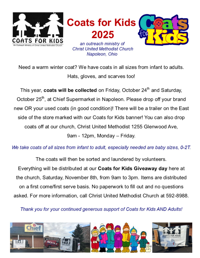 October 25, 2025, – Coats for Kids Collection Community Location: Chief Supermarket, 1247 Scott St, Napoleon, OH 43545 Coats for Kids collection is happening THIS FRIDAY AND SATURDAY, OCTOBER 24th & 25th Please drop off your gently used or brand new coats (we also accept: hats, scarves gloves, boots, snow pants)