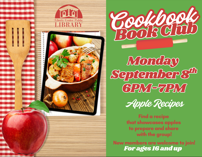 September 8, 2025, 6:00 PM–7:00 PM Cookbook Book Club at LC Library Arts and Culture, Community Location: Liberty Center Public Library 124 East St., Liberty Center, OH, United States, Ohio 43532 Apple Recipes! |