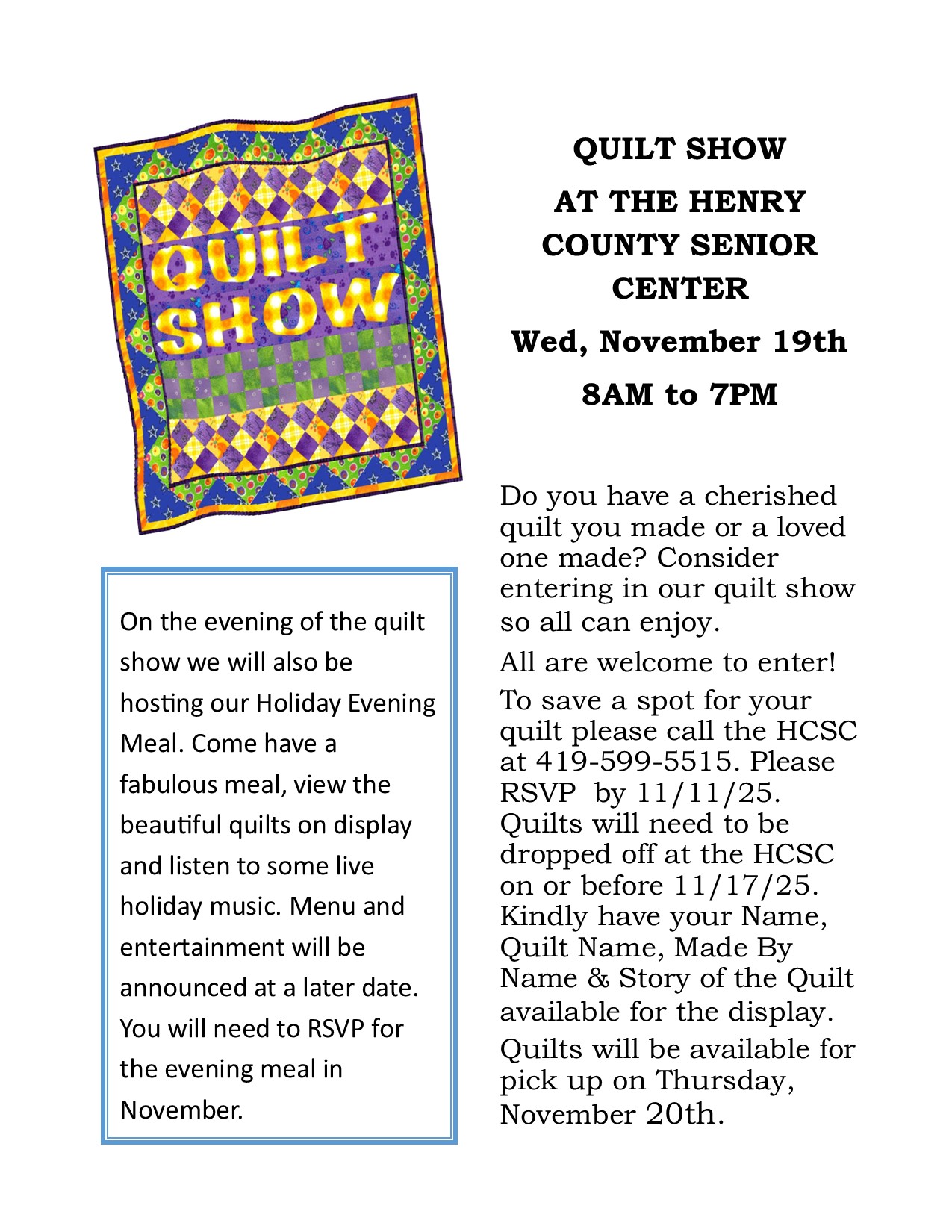 November 19, 2025, 8:00 AM–7:00 PM Quilt Show at Henry County Senior Center Arts and Culture, Community Location: Henry County Senior Center, 203 Rohrs St, Napoleon, OH 43545 Do you have a cherished quilt you made or a loved one made? Consider entering in our quilt show so all can enjoy. |