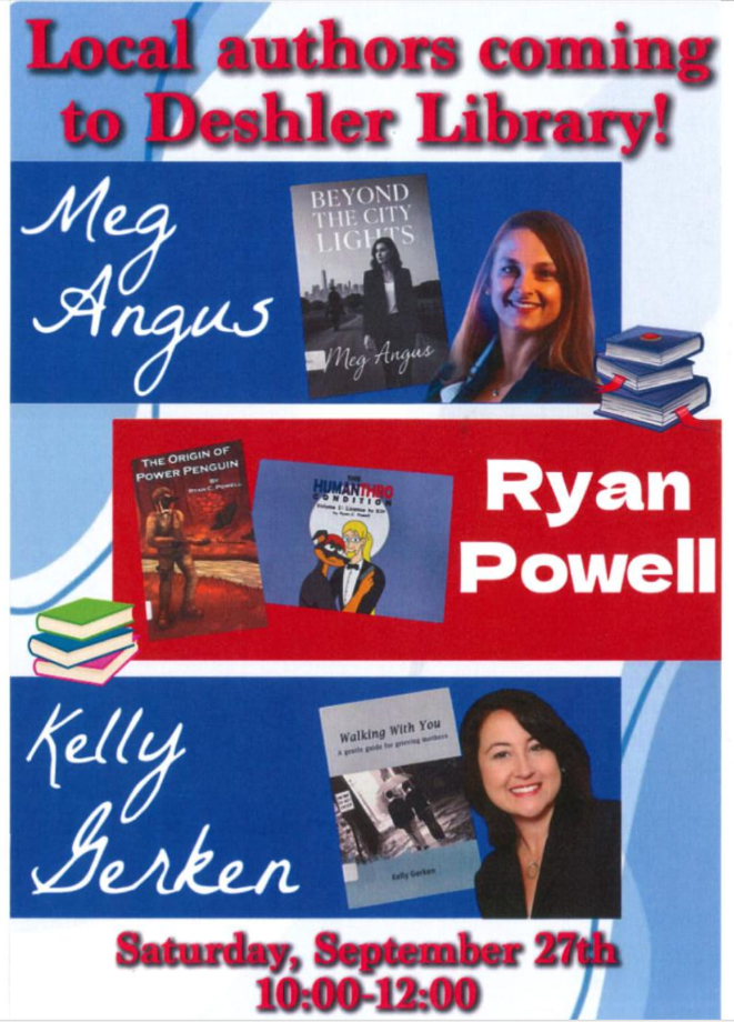 September 27, 2025, 10:00 AM–12:00 PM Meet 3 local authors at Deshler Library Arts and Culture, Community Location: Deshler Public Library, 208 N East Ave, Deshler, OH 43516 Please join us on Saturday, September 27th for an Open House from 10am-12pm for an Author Signing/Launch Party
