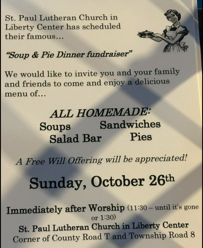 October 26, 2025, 11:30 AM–1:30 PM Soup and Pie Dinner at St Paul LC Church Event, Community, Fundraiser – Food Location: St Paul Lutheran Church, 8074 County Road T, Liberty Center, OH 43532 Soups, Sandwiches, Salad Bar, and Pies! Free will offering will be appreciated! |
