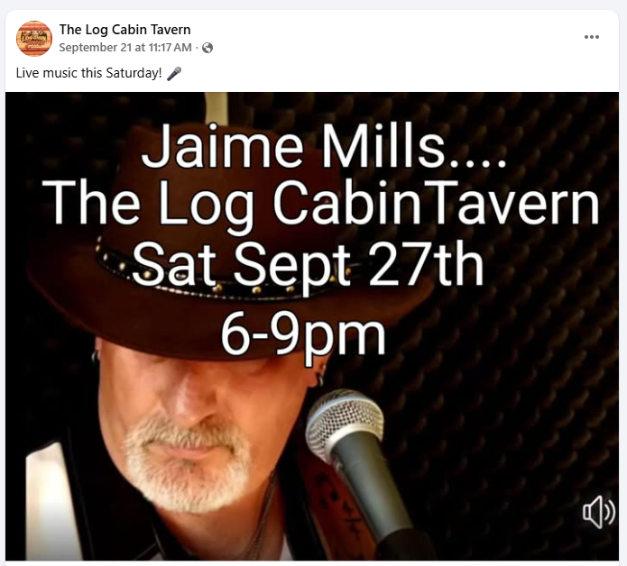 September 27, 2025, 6:00 PM–9:00 PM Jaime Mills at The Log Cabin Tavern Arts and Culture, Community Location: The Log Cabin Tavern, T464 County Road 3, Liberty Center, OH 43532 Live music Saturday! 🎤 |