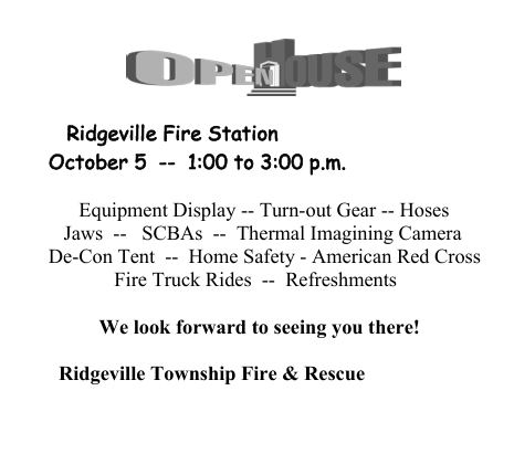 October 5, 2025, 1:00 PM–3:00 PM Ridgeville Fire Dept Open House Community, Information Location: Ridgeville Fire Department, 20601 State Route 6, Ridgeville Corners, OH 43555 The Department is hosting an Open House on October 5 from 1:00 p.m. to 3:00 p.m. It will be an afternoon filled with a display of all the equipment, games for children and more. |