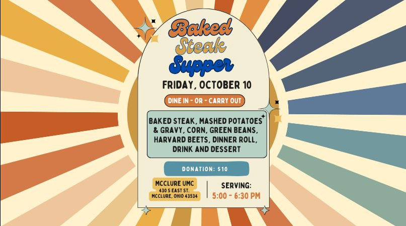 October 10, 2025, 5:00 PM–6:30 PM Baked Steak Dinner at McClure UMC Church Event, Community, Fundraiser – Food Location: McClure United Methodist Church, 430 S East St, McClure, OH 43534 It’s time for our October Steak Supper! Mark your calendar now and invite a friend! All the great food as usual, for a donation of only $10 or more! McClure United Methodist Church, 430 S. East Street, in McClure. |