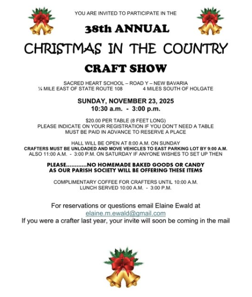 November 23, 2025, 10:30 AM–3:00 PM Christmas in the Country Craft Show at Sacred Heart Arts and Culture, Community Location: Sacred Heart Catholic Church, 13779 County Road Y, New Bavaria, Ohio 43548 See flyer attached for more information! |
