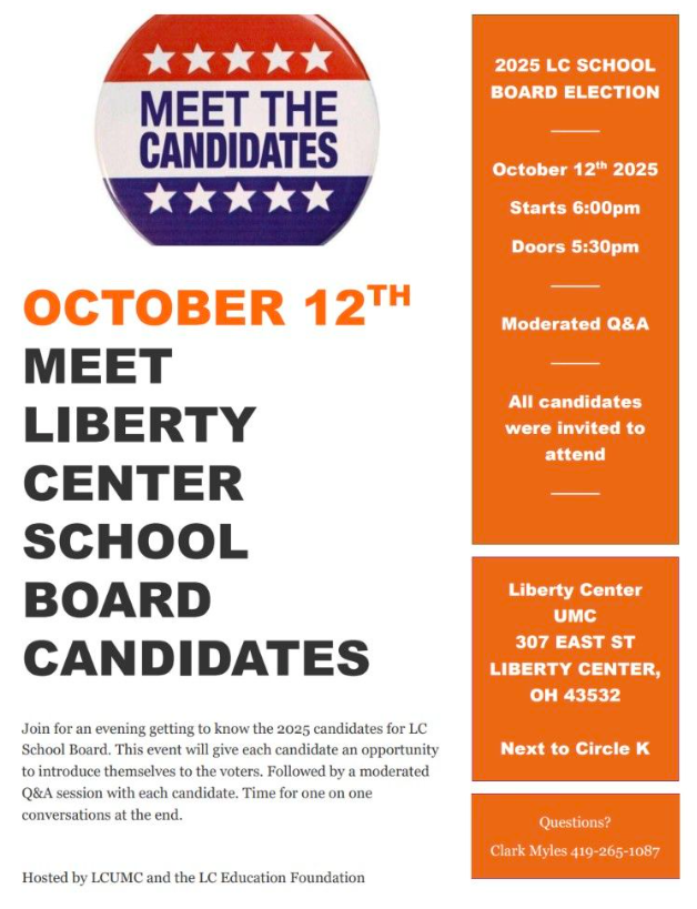 October 12, 2025, 6:00 PM– Meet the LC School Board Candidates Community, Schools Location: Liberty Center United Methodist Church, 307 East Street, Liberty Center, Ohio 43532 Join for an evening getting to know the 2025 candidates for LC School Board. This event will give each candidate an opportunity to introduce themselves to the voters. Followed by a moderated Q&A session with each candidate. Time for one-on-one conversations at the end. See flyer attached for more information! |