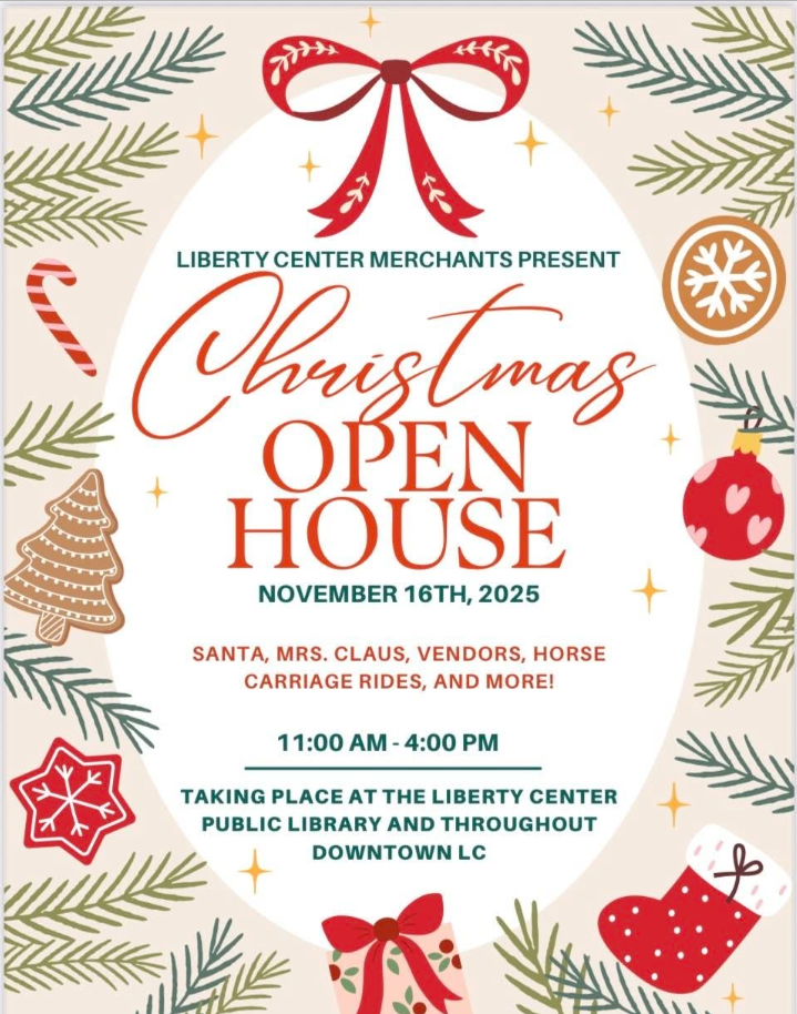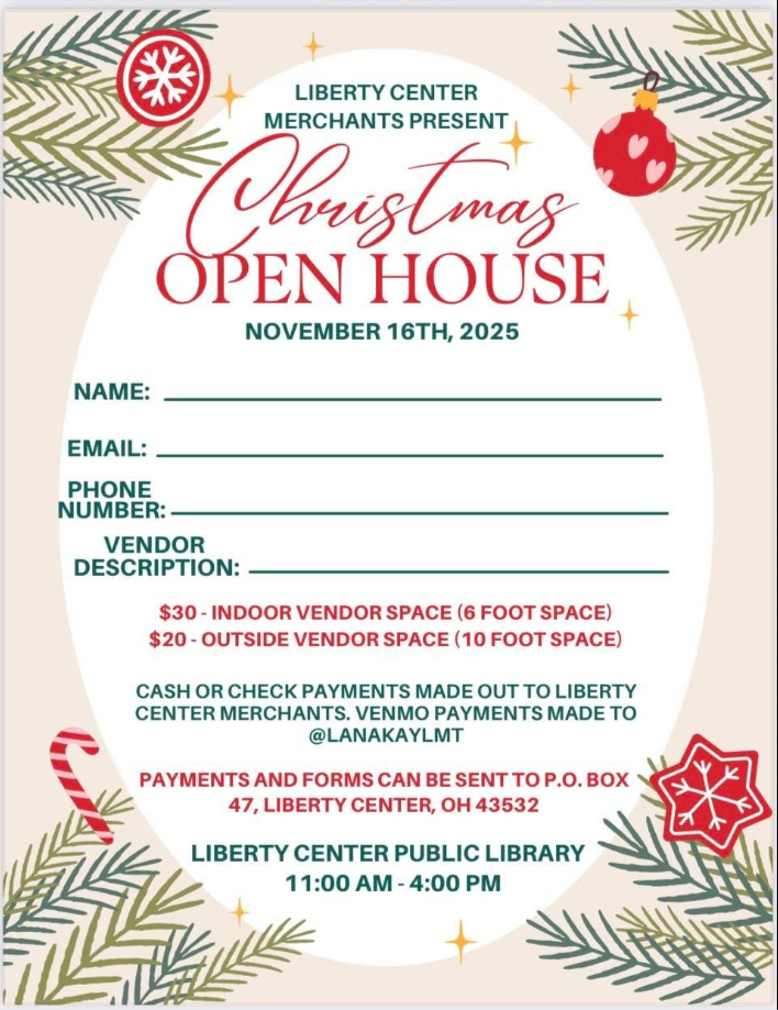 November 16, 2025, 11:00 AM–4:00 PM Liberty Center Merchants Christmas Open House Arts and Culture, Community Location: Liberty Center Public Library, 124 East St, Liberty Center, OH 43532 See flyers attached for more information on the event and becoming a vendor!