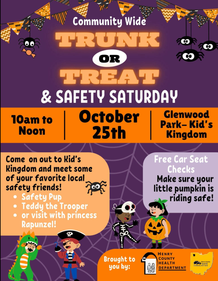 October 25, 2025, 10:00 AM–12:00 PM Henry County Health Department Trunk or Treat Community Location: Glenwood Park, 521 Glenwood Ave, Napoleon, OH 43545 See flyer attached for details! |