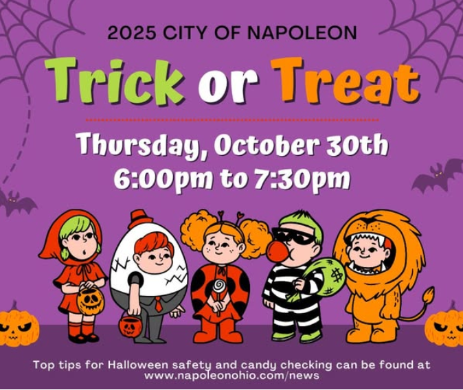 October 30, 2025, 6:00 PM–7:30 PM Trick or Treat in Napoleon Community, Holiday Location: Napoleon, Ohio 43545 City of Napoleon Trick or Treat is scheduled for Thursday, October 30, 2025 from 6:00pm to 7:30pm. |