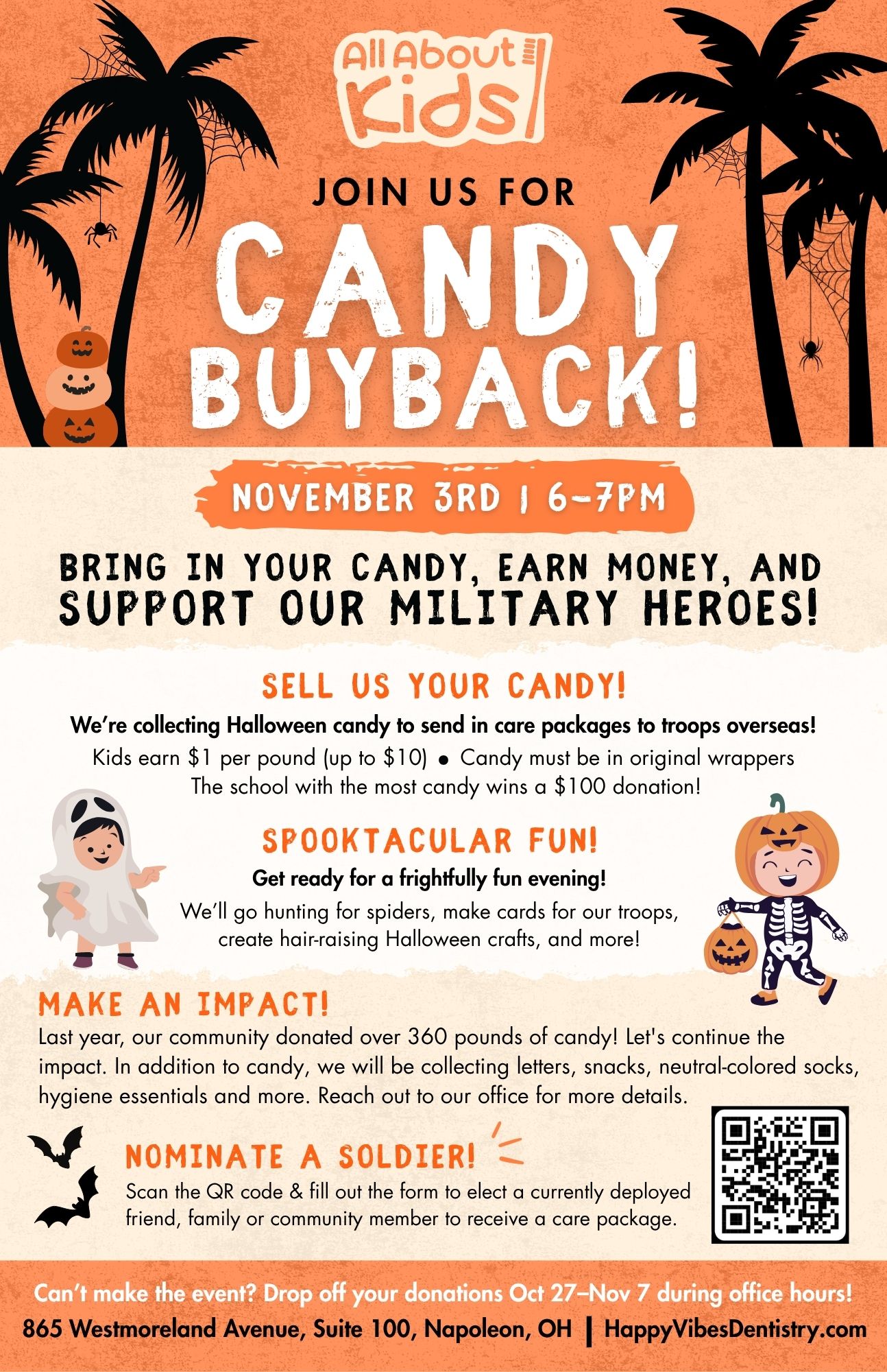 Join us for a fun, family-friendly evening at All About Kids! Bring in your extra Halloween candy, earn some cash, and help us support our military heroes overseas.