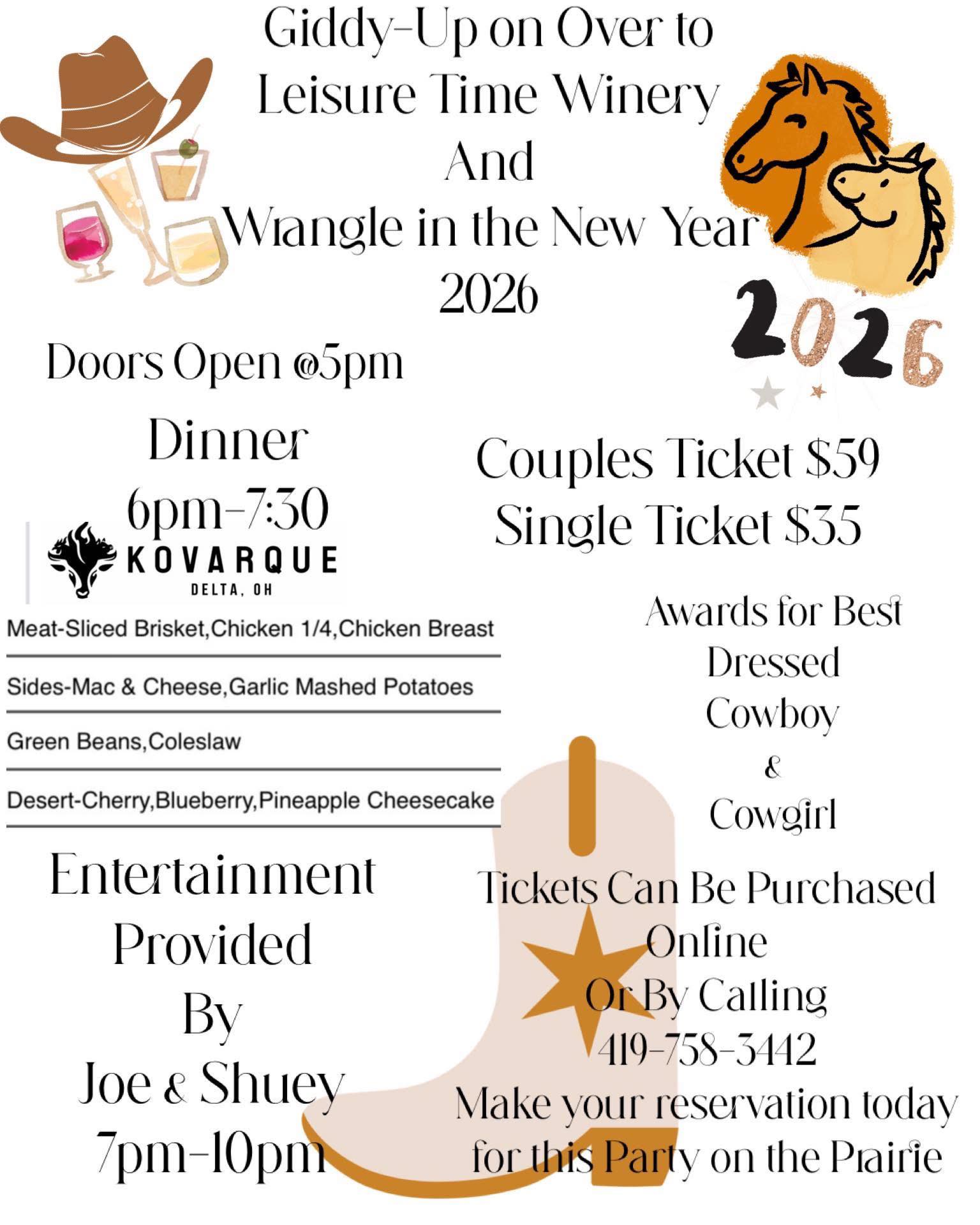 December 31, 2025, 5:00 PM– New Year’s Eve Party at Leisure Time Community, Holiday Location: Leisure Time Winery, 16982 County Road M2, Napoleon, OH 43545 See flyer for more information