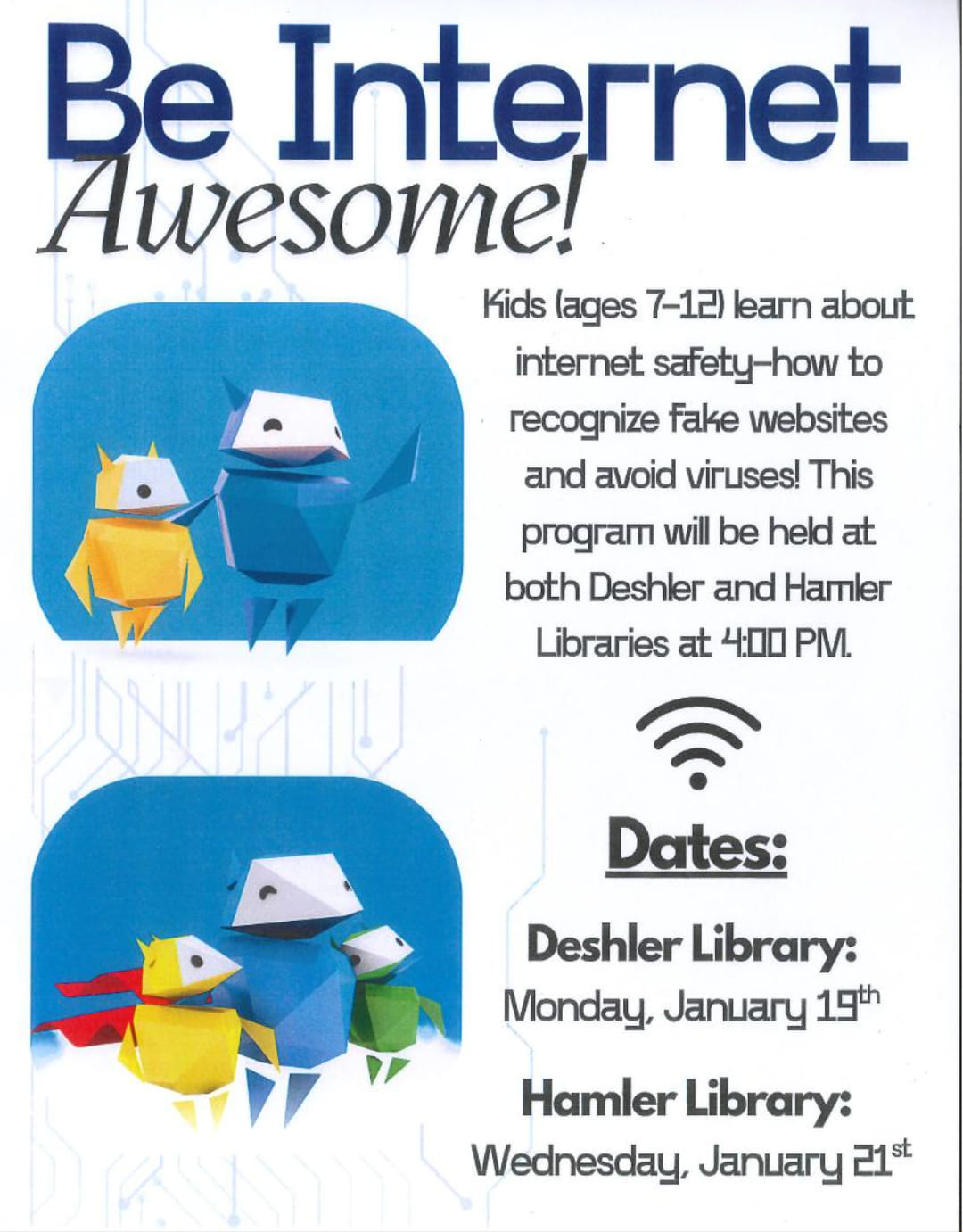 January 19, 2026, 4:00 PM– Be Internet Awesome at Hamler Library Community, Continuing Education, Information Location: Hamler Public Library, 230 Randolph St, Hamler, OH 43524 See flyer for more information