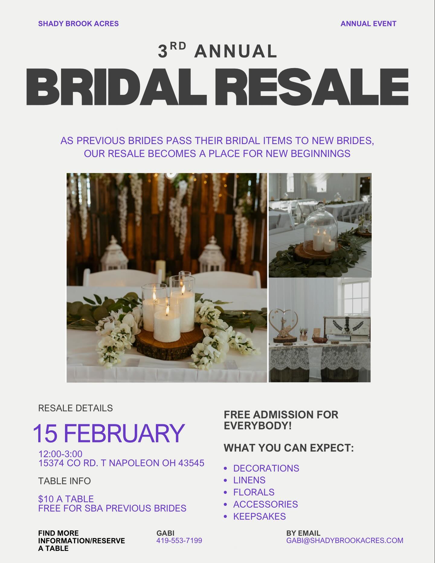 February 15, 2026, 12:00 PM–3:00 PM 3rd Annual Bridal Resale at Shady Brook Acres Business, Community, Shopping Location: Shadybrook Hitching Post, 15374 County Road T, Napoleon, OH 43545 See flyer for more information