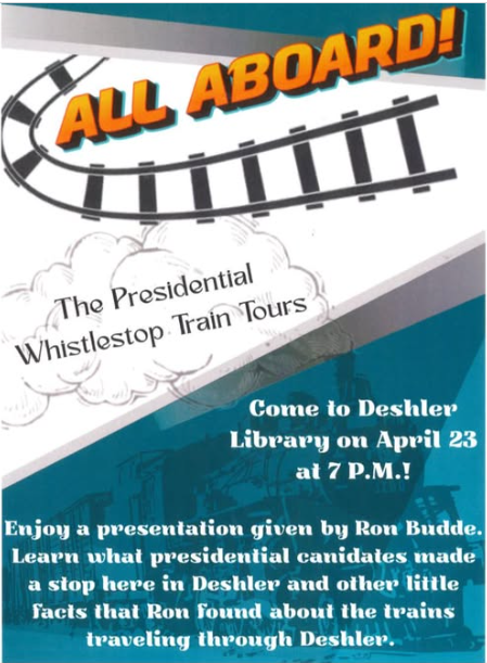 April 23, 2026, 7:00 PM– Whistle Stop Presentation at Deshler Public Library Community, Information Location: Deshler Public Library, 208 N East Ave, Deshler, OH 43516 Do you think you know how many presidents did campaign whistle stops in the Corn City? Chances are you won’t get the answer correct…..there were a lot more than you think……I will be doing a presentation at the Deshler Library on this very topic. I have spent most of the winter going back through old Deshler Flags and also some internet research. I discovered some fascinating stories about all of these stops and I have over 60 pictures that will be shown along with the talk. The date is Thursday, April 23rd and the time is 7:00pm. You won’t want to miss it! **Attached is an example of whistle stop flyer**
