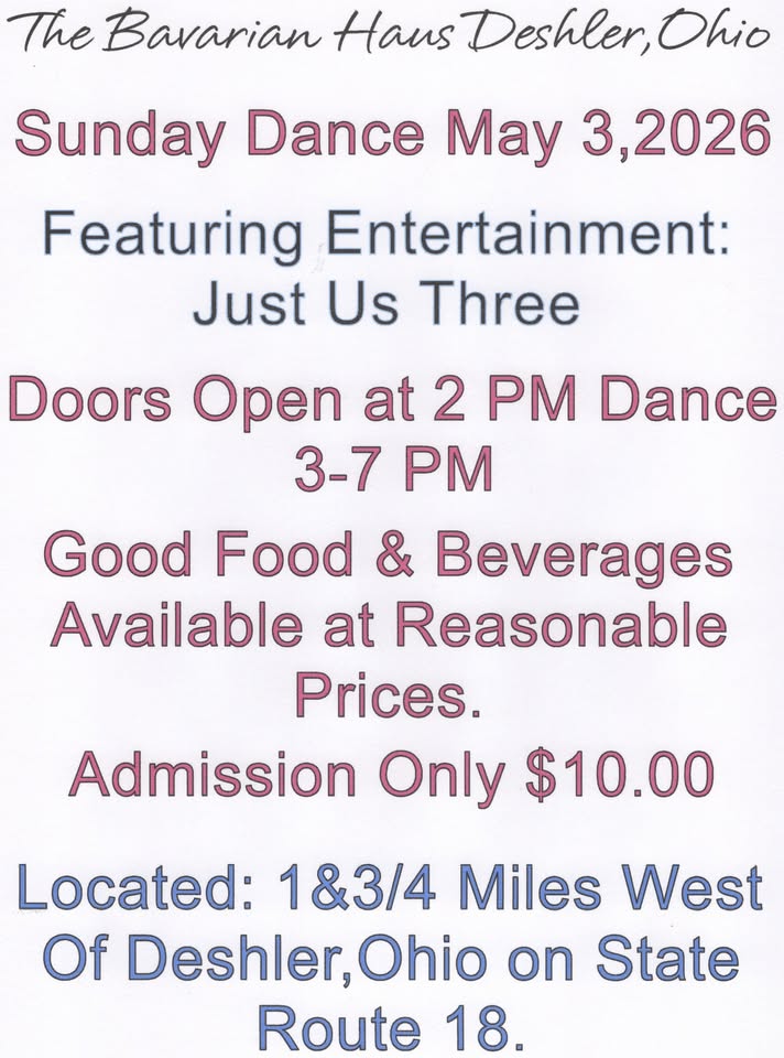 May 3, 2026, 2:00 PM–7:00 PM Public Sunday Dance with Just Us Three at Bavarian Haus Community, Recreation and Sports Location: Bavarian Haus, 3814 State Route 18, Deshler, OH 43516 Come and Dance! See flyer for more information