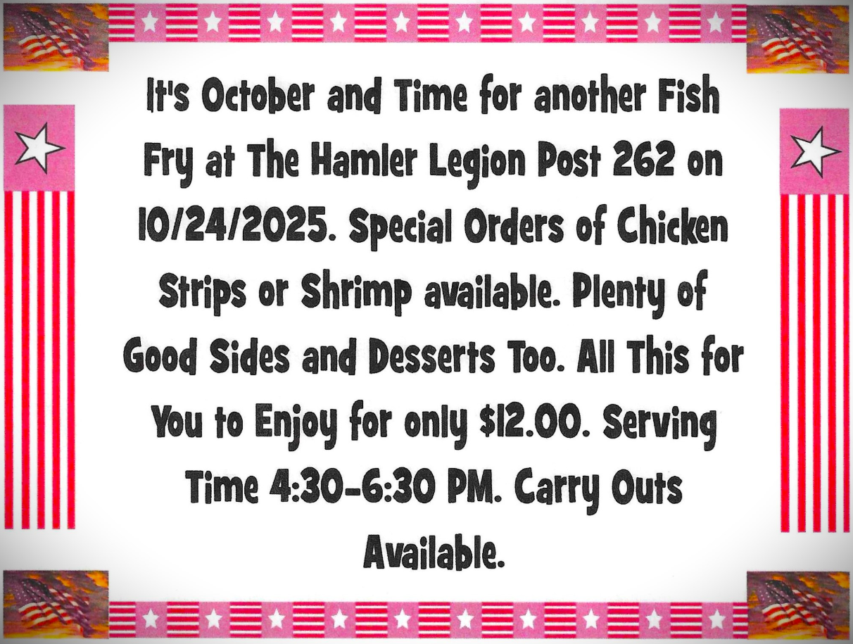 THE HAMLER AMERICAN LEGION POST 262 WILL SPONSOR A SECOND FISH FRY IN OCTOBER. REASON WHY: November 2,2025 will be having the Annual Thanksgiving Turkey Dinner. So, Save the Date for a Great Meal as Always