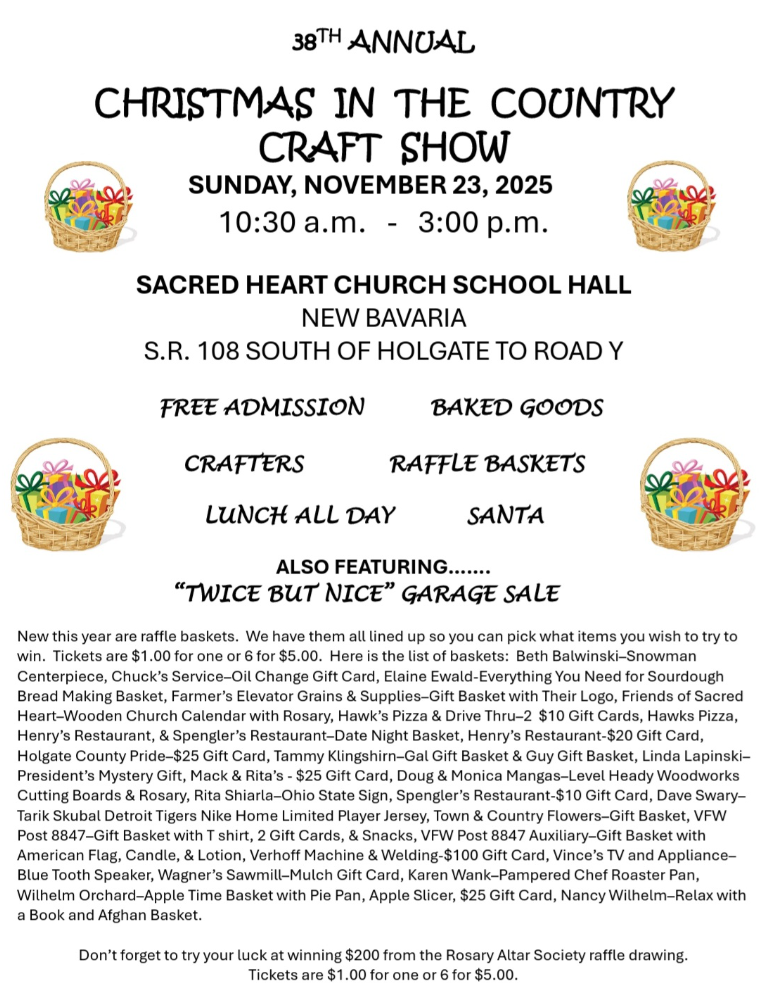 New this year: the Porches and Pews Tour! This special ticketed experience will invite guests into area homes and churches to enjoy the sights of Christmas and pick up a holiday treat along the way. Tickets may be purchased at APA Solar, Ridgeville Telephone Company, Salon 1915 and Sherwood State Bank in Archbold. (See Facebook page)